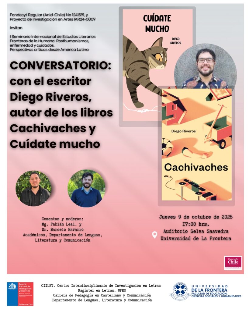 En el marco del I Seminario Internacional de Estudios Literarios: Fronteras de lo Humano: Posthumanismo, enfermedad y cuidados. Perspectivas críticas desde América Latina, se realizará un conversatorio con el escritor chileno Diego Riveros Miranda, autor de Cachivaches (2020) y Cuídate mucho (2024). La actividad se llevará a cabo el jueves 9 de octubre de 2025, a las 17:00 horas, en el Auditorio Selva Saavedra de la Universidad de La Frontera.