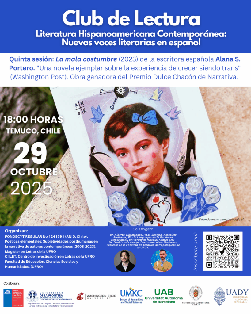 El miércoles 29 de octubre a las 18:00 horas se realizará la quinta sesión del Club de Lectura: Literatura Hispanoamericana Contemporánea. Nuevas voces literarias en español, iniciativa organizada por académicos del Departamento de Lenguas, Literatura y Comunicación de la Facultad de Educación, Ciencias Sociales y Humanidades de la Universidad de La Frontera (UFRO).